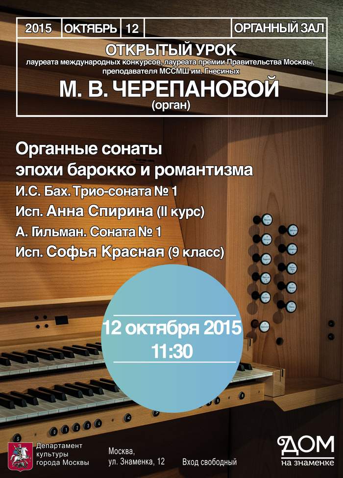 12 октября 2015 Начало в 11:30 Органный зал МССМШ им. Гнесиных. Вход свободный |