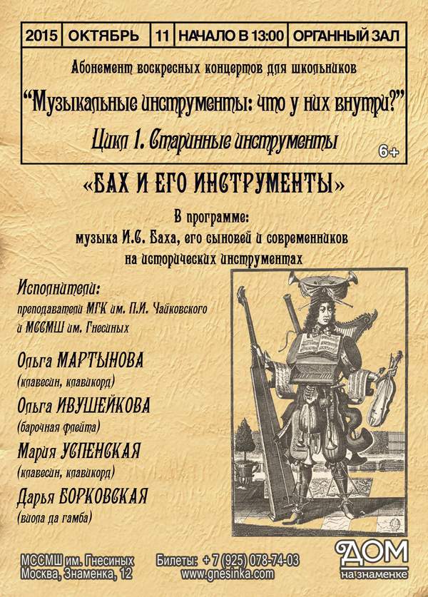 «Музыкальные инструменты: что у них внутри?» Цикл I. Старинные инструменты![]() Новый абонемент для детей школьного возраста – в Доме на Знаменке! Органный зал (Дом на Знаменке) МССМШ им. Гнесиных, Знаменка, 12 Начало в 13.00 Как интересно и с пользой провести воскресный день с детьми? Можно придумать нечто совершенно необычное и увлекательное: прийти в знаменитую Школу им. Гнесиных – старинный особняк в самом центре Москвы, куда закрыт вход посторонним, – и всей семьей попасть в музыкальную атмосферу прошлых веков. Новый концертный абонемент для детей и подростков «Музыкальные инструменты: что у них внутри?» – это цикл из четырех воскресных дневных концертов. В программе – музыка эпох барокко и классицизма. Но это не просто концерты старинной музыки. Здесь исполнители играют на исторических инструментах, которые существовали во времена Моцарта и даже раньше! Среди них – сделанные по чертежам 18-19 вв. клавесины, клавикорды, «моцартовское» фортепиано» 1788 года, настоящий духовой орган, барочная виолончель, клавир 1810 года, виола да гамба, и это далеко не всё! На концертах прозвучит музыка И.С. Баха, Рамо, Куперена, Моцарта, Гайдна, Бетховена и др. – в сопровождении увлекательных рассказов ведущего. В абонементе примут участие преподаватели, учащиеся и студенты Школы им. Гнесиных и Московской консерватории. Очень важно, что любые вопросы дети смогут задать прямо из зала – музыканты с радостью на них ответят. Кроме того, каждая программа предложит оригинальный интерактив – ребята смогут потрогать, разобрать инструменты и увидеть, что скрывается у них внутри, разучат старинный танец или станут участниками оркестра ударных инструментов. Музыкальное путешествие в мир старинных инструментов начинается! Не пропустите! Продажа билетов – с 15 сентября 2015 г. Концерт № 1 11 октября 2015 г. «Бах и его инструменты» Иоганн Себастьян Бах писал музыку для самых разных инструментов. С некоторыми из них юные слушатели познакомятся на первом концерте абонемента, услышав баховские Инвенции и Маленькие прелюдии, фрагменты сонат для флейты и клавесина, пьесы сыновей Баха и его современников. А еще дети узнают, как устроен изнутри предшественник фортепиано – клавесин, поучаствуют в процессе разбора инструмента и смогут подержать в руках его детали. Концерт № 2 6 декабря 2015 г. «Вокруг клавесина за 80 минут» Меломаны 18 века не могли использовать современные гаджеты для прослушивания любимых композиций – чтобы наслаждаться музыкой, им приходилось самим обучаться музыкальной игре. Для этого особенно удобны были клавесины и верджинелы – прародители современного фортепиано. Именно для этих инструментов создавали свою музыку Бёрд, Булл, Куперен и Рамо, сочинения которых вошли в программу «Вокруг клавесина за 80 минут». На этом концерте дети разучат старинные танцевальные движения – при помощи участников Ансамбля исторического танца (Факультет старинного и современного исполнительского искусства Московской консерватории, рук. Н. Кайдановская).